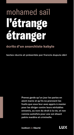 Mohamed Saïl (1894-1953) fut toute sa vie un ardent militant contre le colonialisme et le capitalisme. Déserteur lors de la Première Guerre mondiale, engagé dans la colonne Durutti pour combattre le fascisme et défendre la révolution, il n’a cessé d’écrire pour la presse anarchiste en France et en Algérie. Francis Dupuis-Déri a rassemblé ici une trentaine de ses articles, rédigés de 1924 à 1951 .