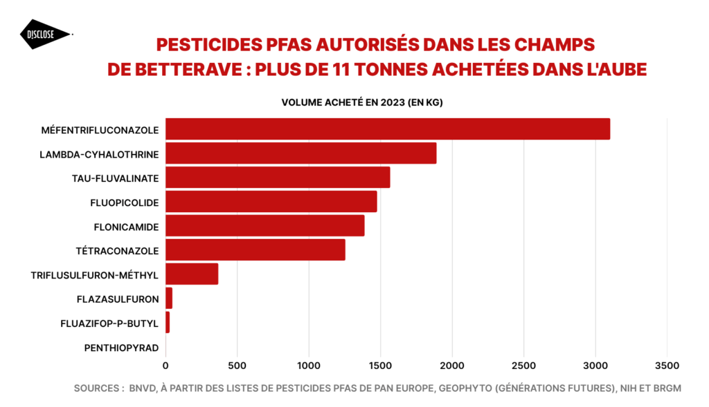 Certaines substances épandues sur les cultures de betteraves appartiennent en effet à la famille des PFAS. Elles sont au nombre de dix, d’après notre analyse de la nomenclature européenne sur les produits phytosanitaires. En recoupant cette liste avec le registre national des pesticides, il ressort que 11 tonnes de ces produits ont été vendus dans le département de l’Aube en 2023.