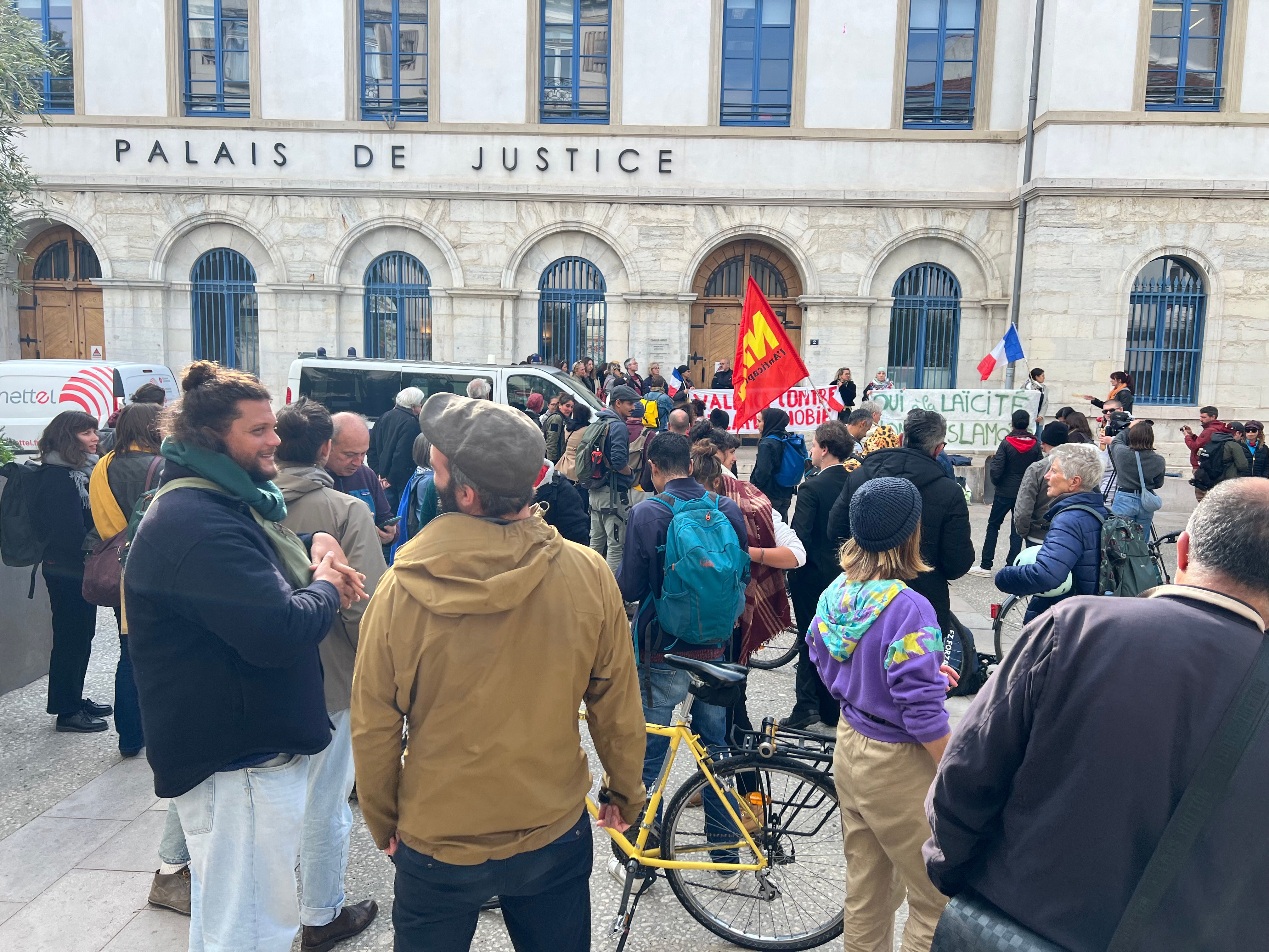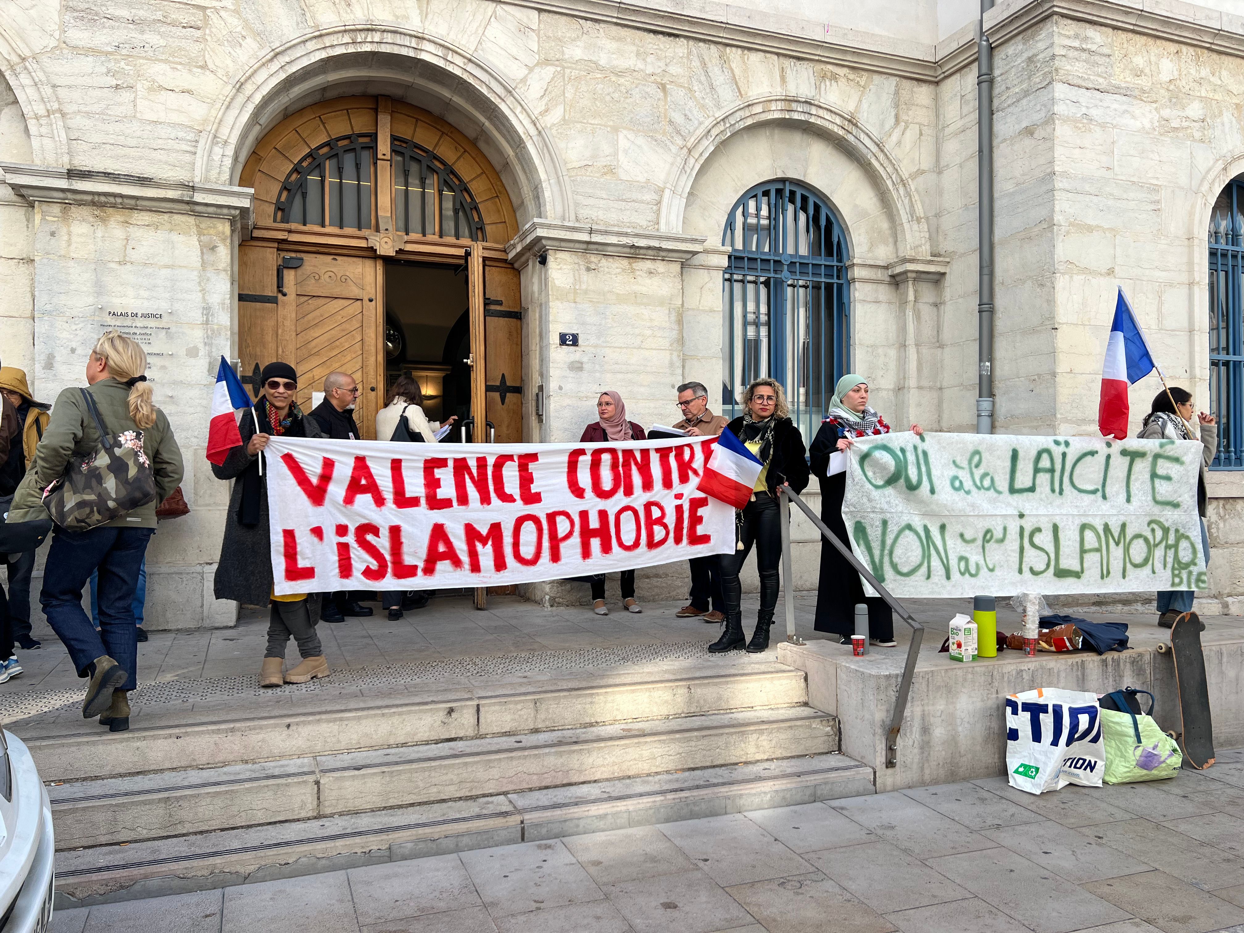 Une demi-heure avant l’audience, une foule se rassemblait devant le tribunal de Valence, à l’appel des collectifs DéterCités et Affronter l’Orage, pour dénoncer « un acharnement islamophobe et appeler à un soutien collectif face à la « fachosphère ».