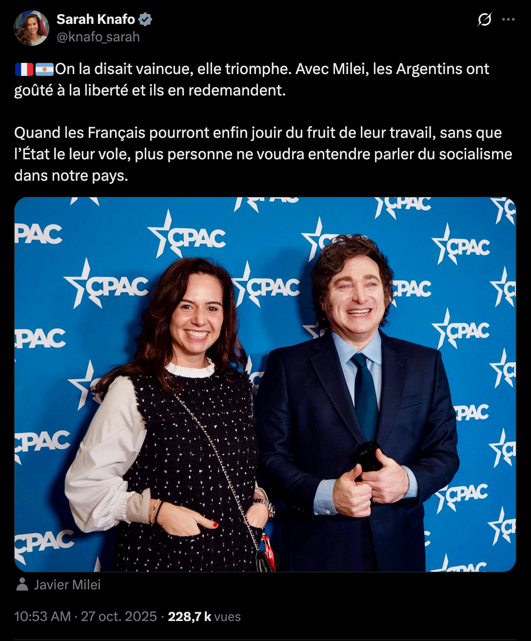 « On la disait vaincue, elle triomphe. Avec Milei, les Argentins ont goûté à la liberté et ils en redemandent », s’extasie sur X, le 27 octobre dernier, Sarah Knafo, du parti d’extrême droite Reconquête !, au lendemain de la victoire électorale du parti présidentiel aux élections législatives en Argentine – 41 % des voix et 80 députés, contre 37 précédemment. La compagne d’Éric Zemmour republie pour l’occasion une photo d’elle tout sourire aux côtés de l’Argentin, prise en février dernier lors de la convention des conservateurs américains à Washington.
