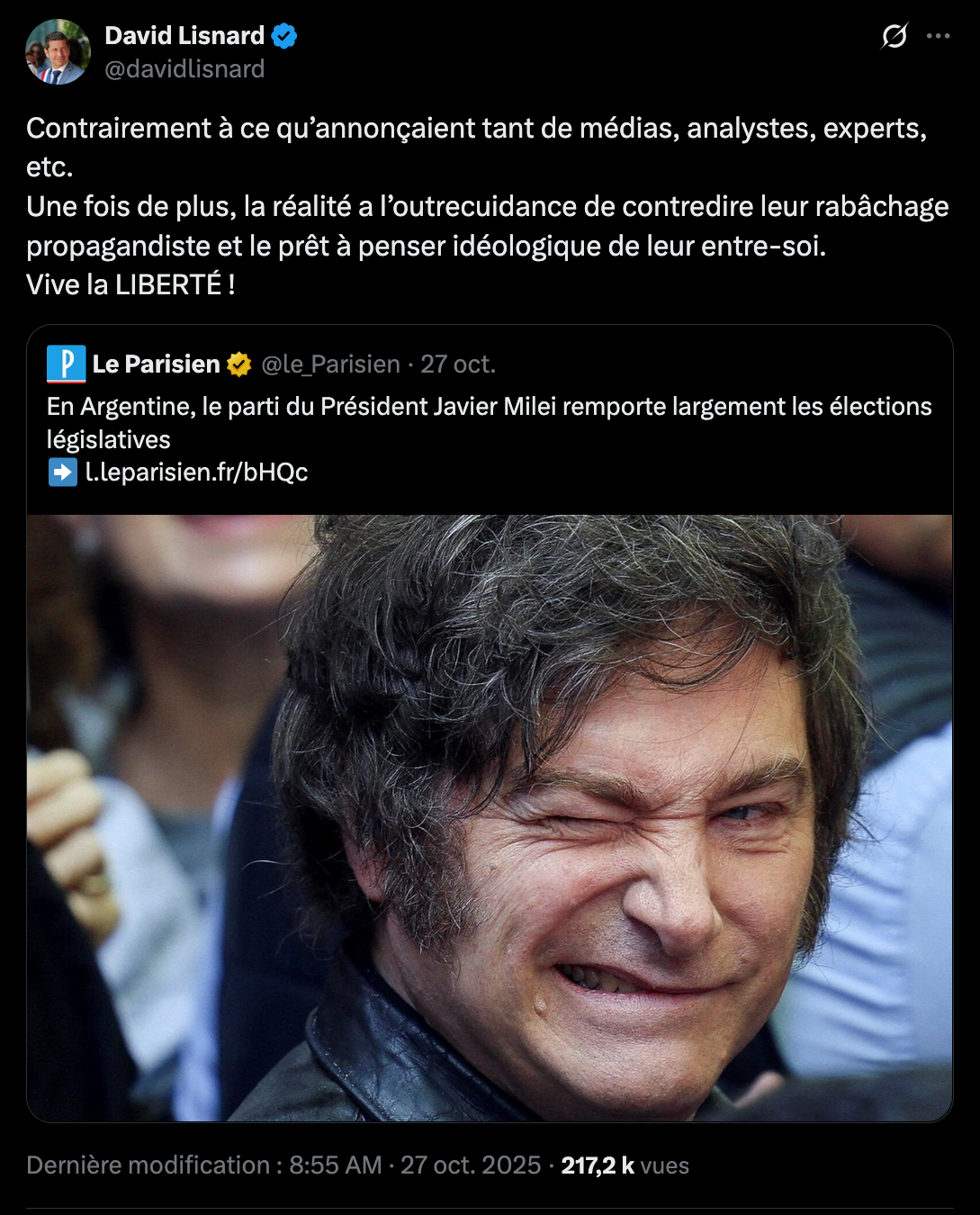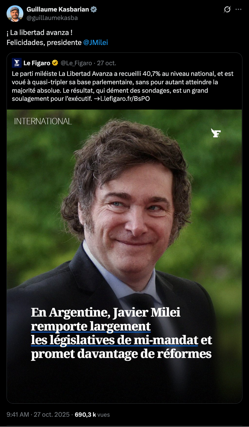 Mais l’enthousiasme gagne aussi certains macronistes, comme l’ex-ministre du Logement Guillaume Kasbarian : « ¡La libertad avanza! ¡Felicidades presidente! » (« La liberté avance — nom du parti de Milei, NDLR —, félicitations, président ! »), poste-t-il sur X.