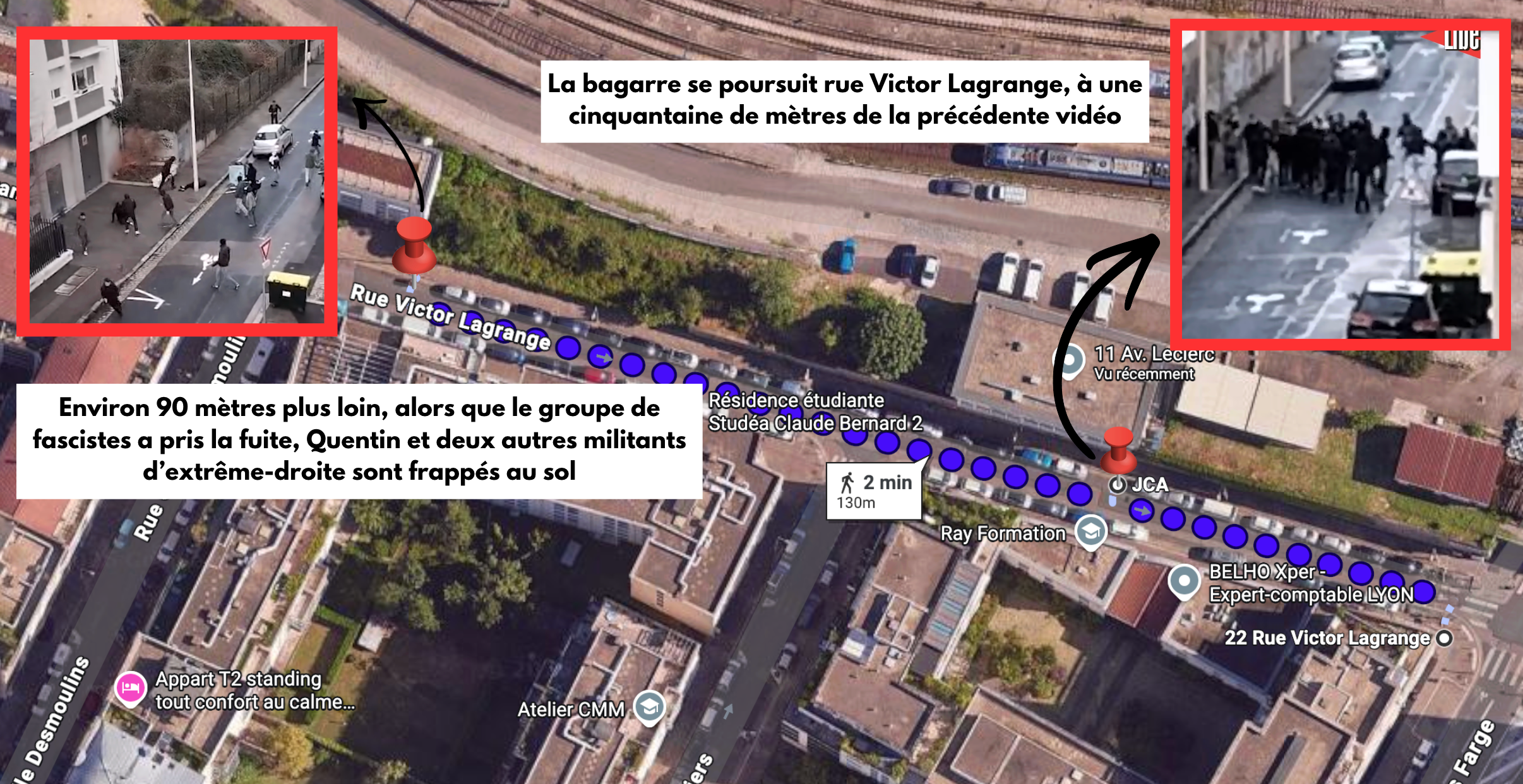 Des images diffusées par Contre Attaque, ainsi qu’une vidéo publiée par Libération, semblent montrer ce qu’il se passe très peu de temps après ce premier affrontement. On peut voir, à cinquante mètres du lieu de la bagarre, le groupe de fascistes dans une posture agressive. La béquille a changé de main, et la gazeuse lacrymogène est tombée par terre. Une vidéo confirme que l’affrontement s’est poursuivi dans la rue Victor Lagrange. C’est dans cette même rue que Quentin ainsi que deux de ses acolytes seront frappés au sol quelques minutes plus tard. Des coups qui entraîneront la mort du jeune militant d’extrême-droite.