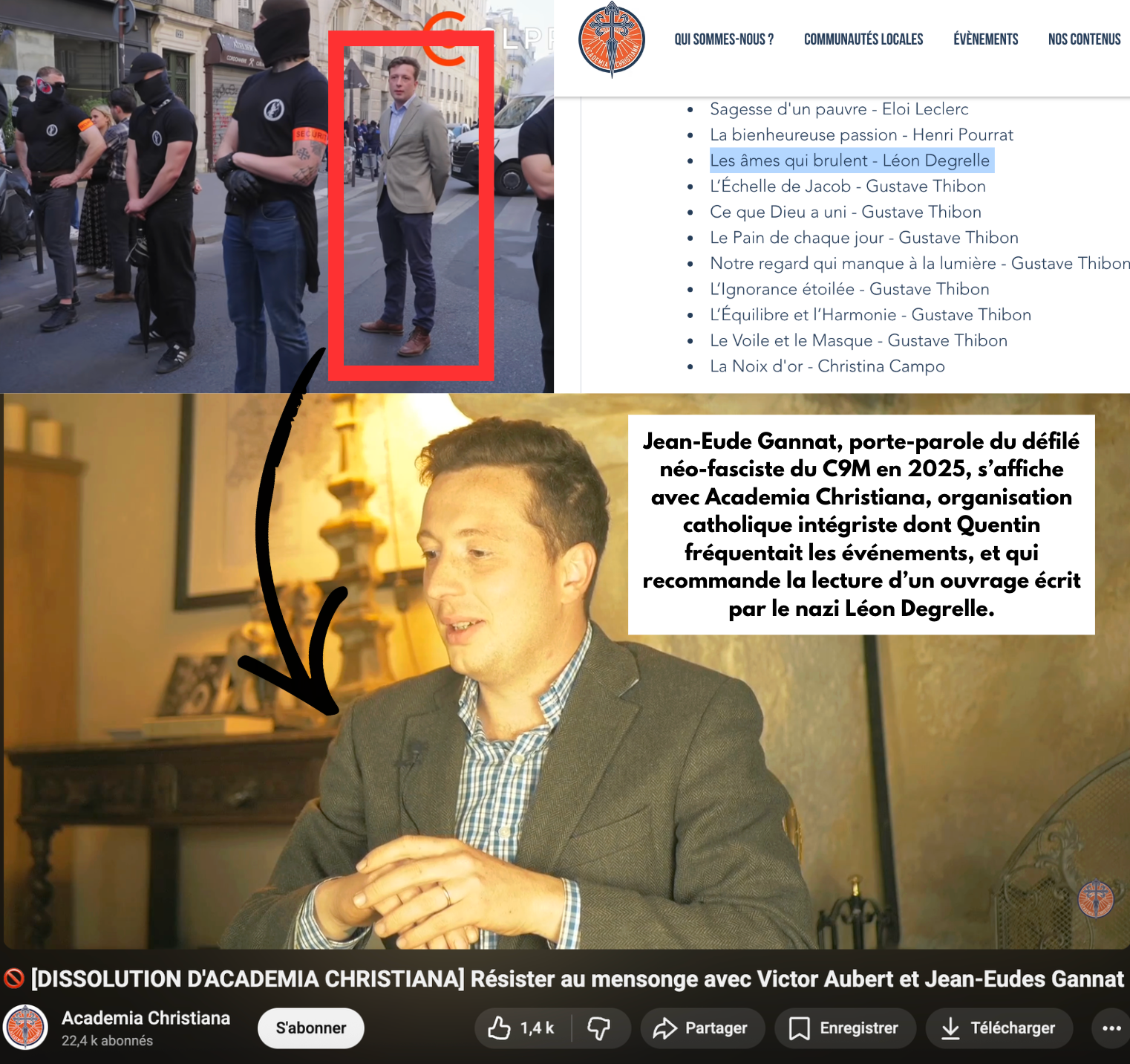La proximité de Quentin avec ce groupe est cohérente avec le reste de ses engagements politiques. Academia Christiana entretient des liens étroits avec Jean-Eudes Gannat, véritable parrain de l’extrême-droite la plus radicale dans l’ouest de la France, et porte-parole en 2025 du défilé néo-fasciste du C9M, auquel avait participé Quentin. Catholique intégriste, Academia Christiana ne rejette pas l’idéologie nazie. Au contraire, on trouve sur le site de l’organisation une liste d’ouvrages dont elle recommande la lecture. Parmi ces livres, on retrouve l’ouvrage Les âmes qui brûlent, écrit par le SS belge Léon Degrelle, alors qu’il combattait sur le front de l’est aux côtés des nazis au cours de la seconde guerre mondiale.