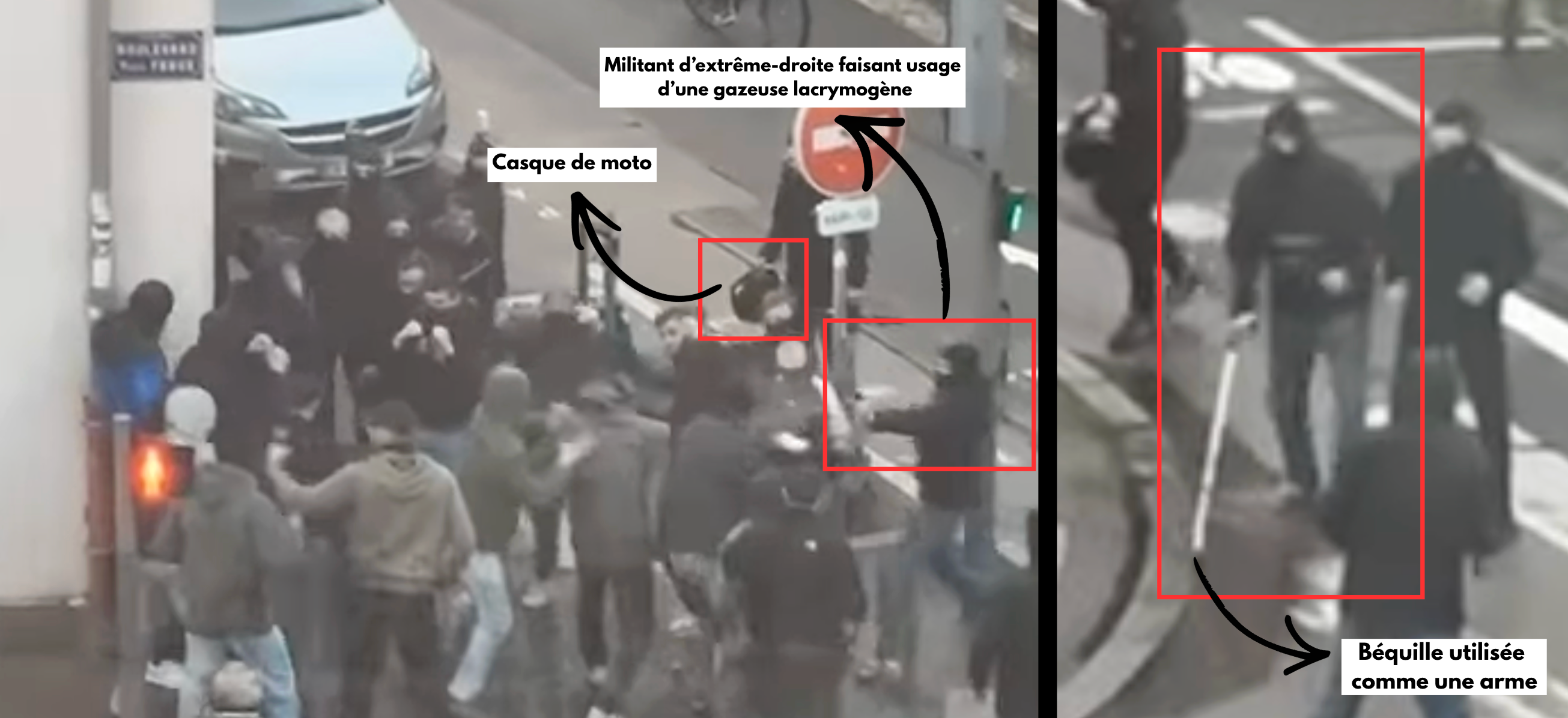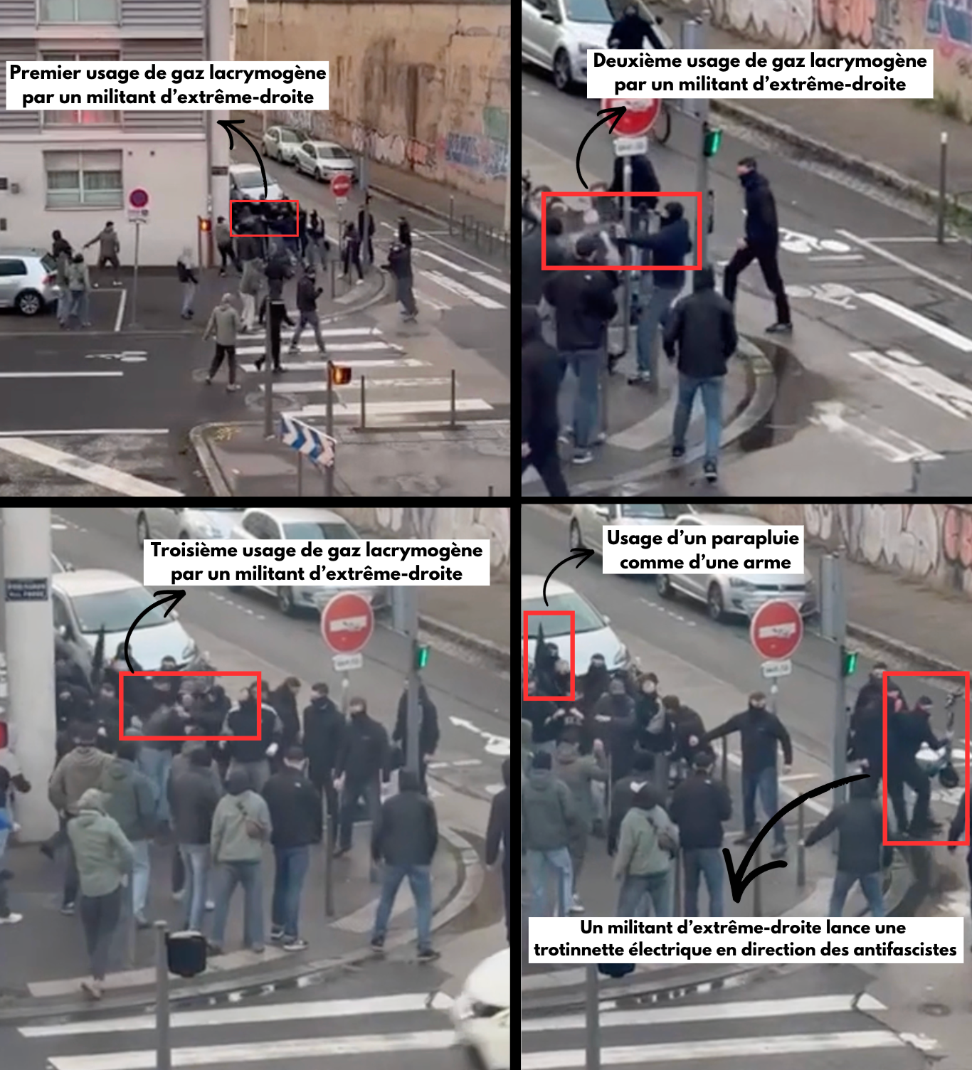 À la toute fin de la vidéo, on peut apercevoir un des fascistes lancer une trottinette électrique en direction des militants de gauche. Un autre est équipé d’une béquille et d’une gazeuse lacrymogène. L’analyse des images permet de déterminer qu’il fait usage de sa gazeuse à au moins trois reprises, et frappe au moins une fois les militants de gauche avec sa béquille. Les vidéos ne permettent pas de déterminer avec certitude le nombre exact de militants dans chaque groupe. Sur l’extrait diffusé par le Canard Enchaîné, on compte 13 antifascistes, et 16 militants d’extrême-droite, mais il est impossible de savoir si des activistes d’un camp ou de l’autre se trouvent hors champ.