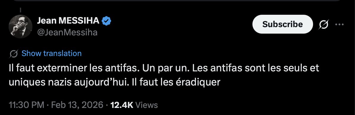 Qu’importe la présomption d’innocence, il fait déjà l’objet d’une chasse à l’homme. Le compte Instagram Free France, qui se présente comme un collectif de « républicains gaullistes », et dont l’activité consiste avant tout à recouvrir de drapeaux français les tags d’extrême-gauche, a mis sa tête à prix. Il appelle les internautes à fournir son adresse ainsi que les lieux qu’il fréquente. La publication a depuis été supprimée. Quant à Jean Messiha, ancien conseiller de Marine Le Pen et habitué des plateaux de Cnews, il encourage carrément, dans une publication supprimée depuis, à exterminer les antifas « un par un ». À la suite de cet appel au meurtre, le député LFI Thomas Portes a effectué un signalement au parquet.
