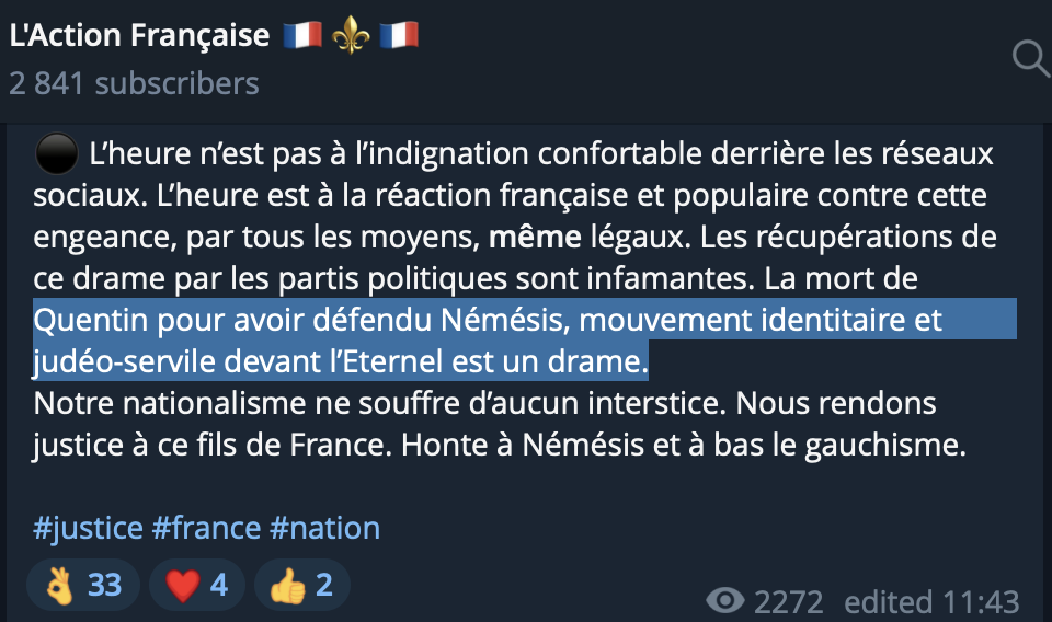 Différents groupuscules lui ont rendu hommage, précisant qu’il avait milité dans leurs rangs, ou participé à des actions à leurs côtés. C’est le cas de l’Action Française, qui indique, dans un post supprimé depuis, que Quentin avait été membre de la section viennoise, en Isère. Illustrant les divisions au sein de l’extrême-droite sur ce drame, une scission de cette organisation, radicalement antisémite, a qualifié le collectif Némésis de « mouvement identitaire et judéo-servile ».