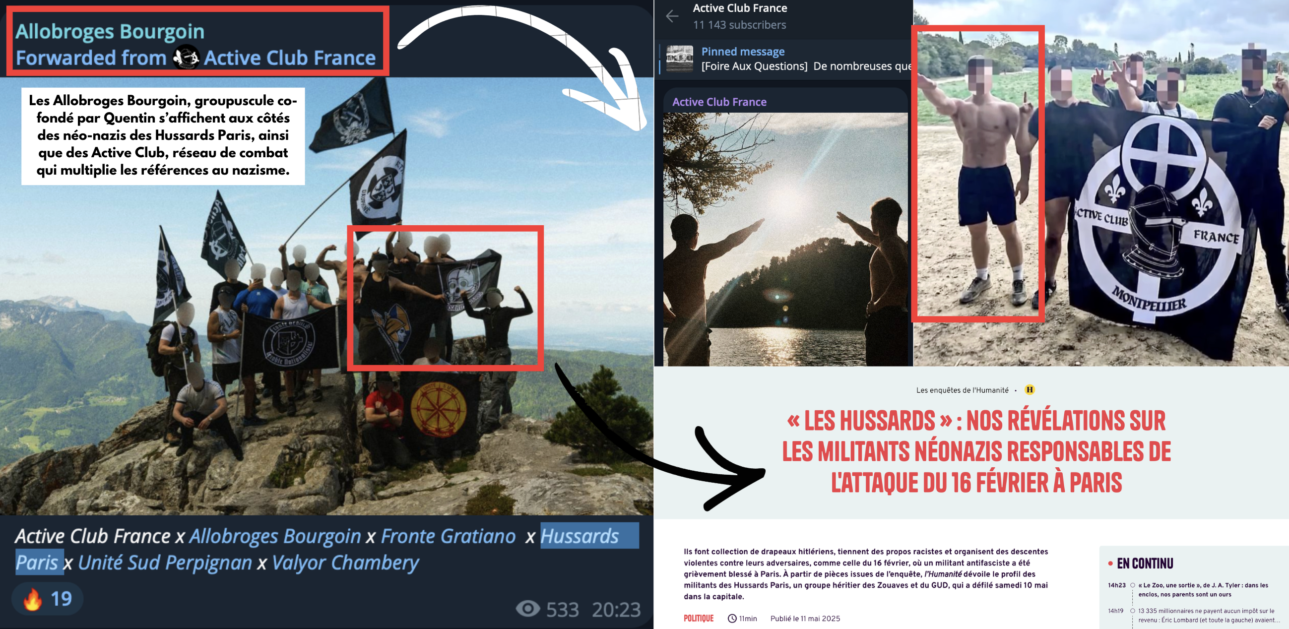 En plus de leur proximité avec les autres groupuscules nationalistes révolutionnaires, les Allobroges Bourgoin entretiennent, selon une enquête de StreetPress, des liens avec les Bourgoin defenders, un groupe hooligan. Si, dans la mouvance d’extrême-droite, les organisations militantes marchent souvent sur une ligne de crête entre une activité politique assumée sous leur vrai nom, et un hooliganisme souterrain, les Allobroges Bourgoin semblent prendre moins de précautions. Ses membres s’affichent ainsi sans complexe aux côtés des groupuscules les plus violents de la mouvance hooligan néo-nazie. Le 2 juin 2025, le groupe partageait ainsi sur son canal Telegram une photo d’une action commune aux côtés d’organisations violentes, en particulier les Hussards Paris. Ce petit groupuscule, basé dans la capitale, et dont le logo est une référence directe à la tête de mort utilisée par les SS, avait fait parler de lui quelques mois plus tôt. Le 16 février 2025, plusieurs militants du groupe avaient agressé des syndicalistes réunis pour assister à une conférence organisée à Paris par le mouvement antifasciste Young Struggle. La vidéo des néo-nazis se repliant aux cris de « Paris est nazi » et « Lyon est nazi aussi » avait fait le tour des réseaux sociaux. En plus des Hussards Paris, on retrouve sur la photo les militants d’Active Club France, un réseau d’extrême-droite s’entraînant au combat, et revendiquant une esthétique ultra-nationaliste, inspirée du néo-nazisme.