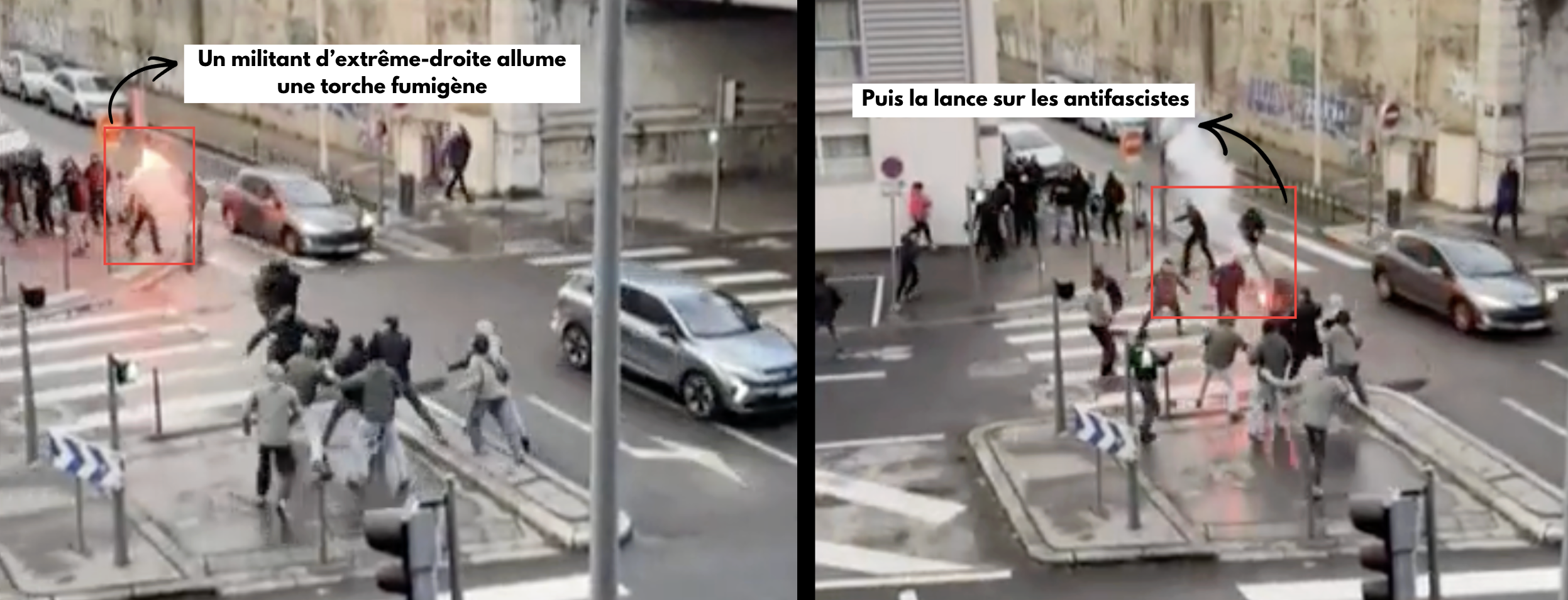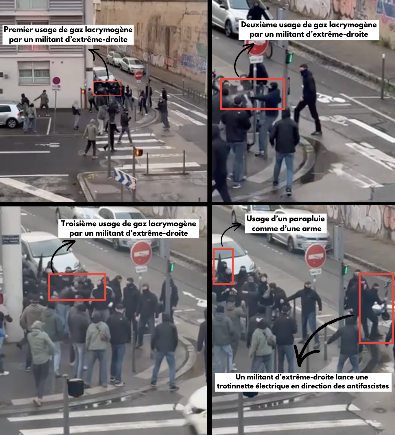 À la toute fin de la vidéo, on peut apercevoir un des fascistes lancer une trottinette électrique en direction des militants de gauche. Un autre est équipé d’une béquille et d’une gazeuse lacrymogène. L’analyse des images permet de déterminer qu’il fait usage de sa gazeuse à au moins trois reprises, et frappe au moins une fois les militants de gauche avec sa béquille. Les vidéos ne permettent pas de déterminer avec certitude le nombre exact de militants dans chaque groupe. Sur l’extrait diffusé par le Canard Enchaîné, on compte 13 antifascistes, et 16 militants d’extrême-droite, mais il est impossible de savoir si des activistes d’un camp ou de l’autre se trouvent hors champ.