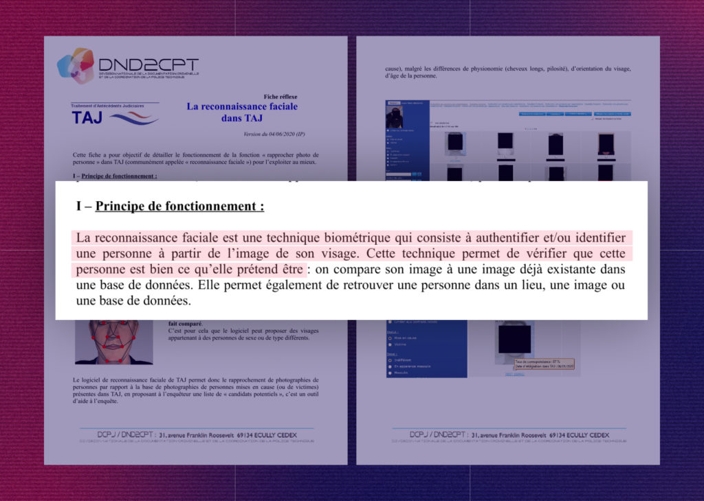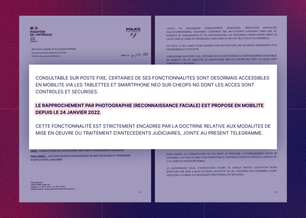 Dans le cas d’Ahmed, les policiers ont donc consulté un fichier de police en le rapprochant d’une photo prise sous la pression. C’est totalement illégal : la consultation du TAJ et l’utilisation de la reconnaissance faciale lors « d’une opération de contrôle d’identité » sont interdites en France. C’est ce que révèle une instruction du ministère de l’intérieur relative à la « consultation de l’application » TAJ, datée de février 2022, que Disclose s’est procurée.