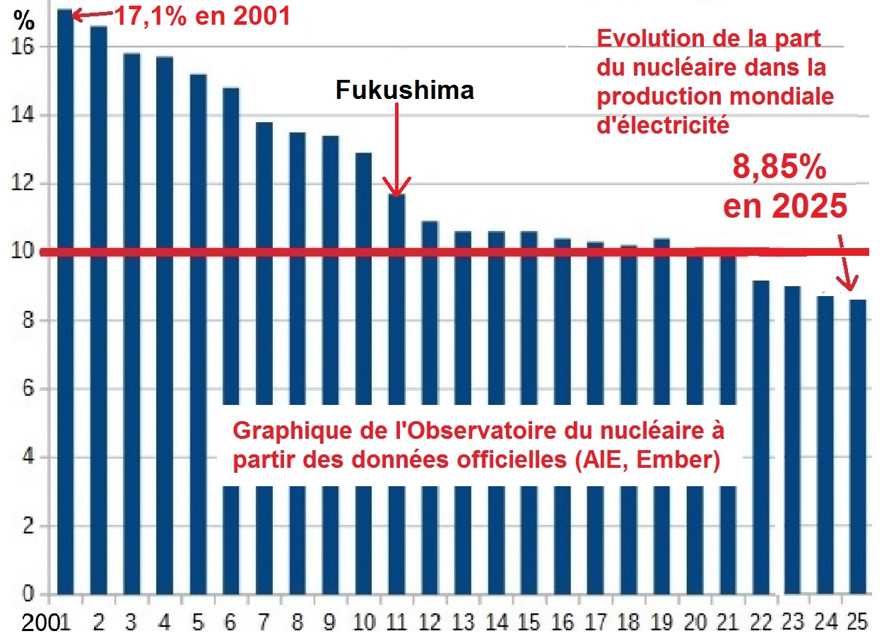 Les chiffres de 2025 sont publiés : après que la part du nucléaire soit tombée en 2021 sous les 10%, elle est passée en 2025 sous les 9%, exactement à 8,85%. Une part désormais proche de la marginalité.