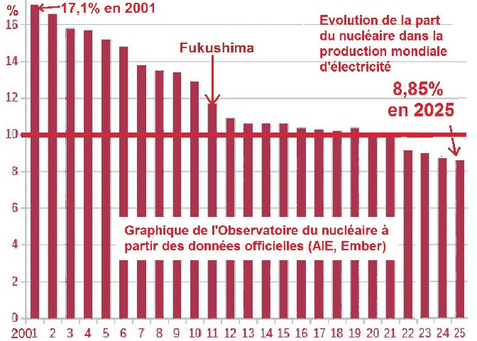 Il est bien sûr encore temps d’annuler les projets nucléaires d’EDF mais, pour y arriver, il serait bon que la population française soit informée de la réalité du nucléaire, à savoir qu’il s’agit d’une industrie sans avenir et dont la part dans la production mondiale d’électricité est désormais marginale et va continuer à se réduire…